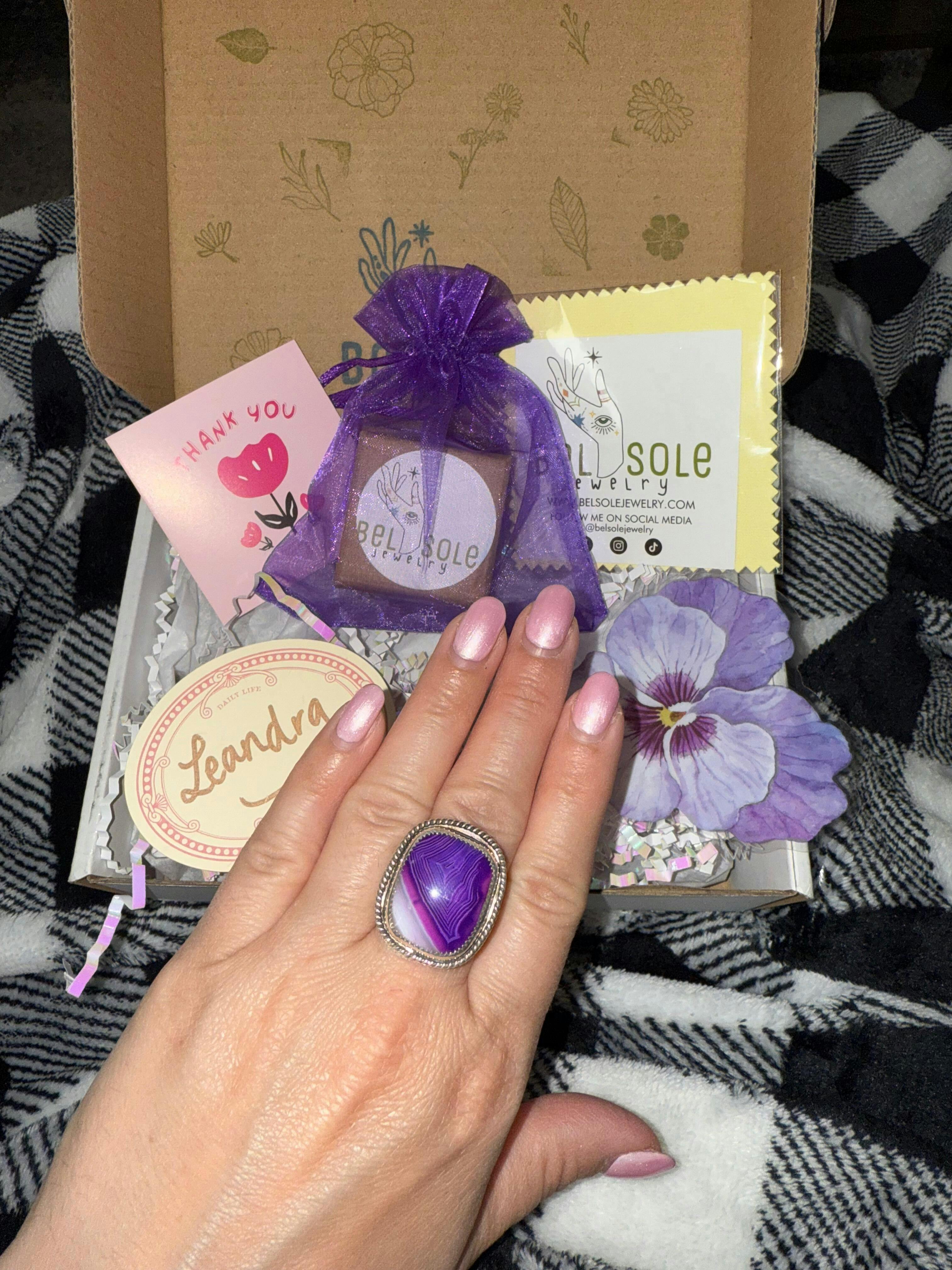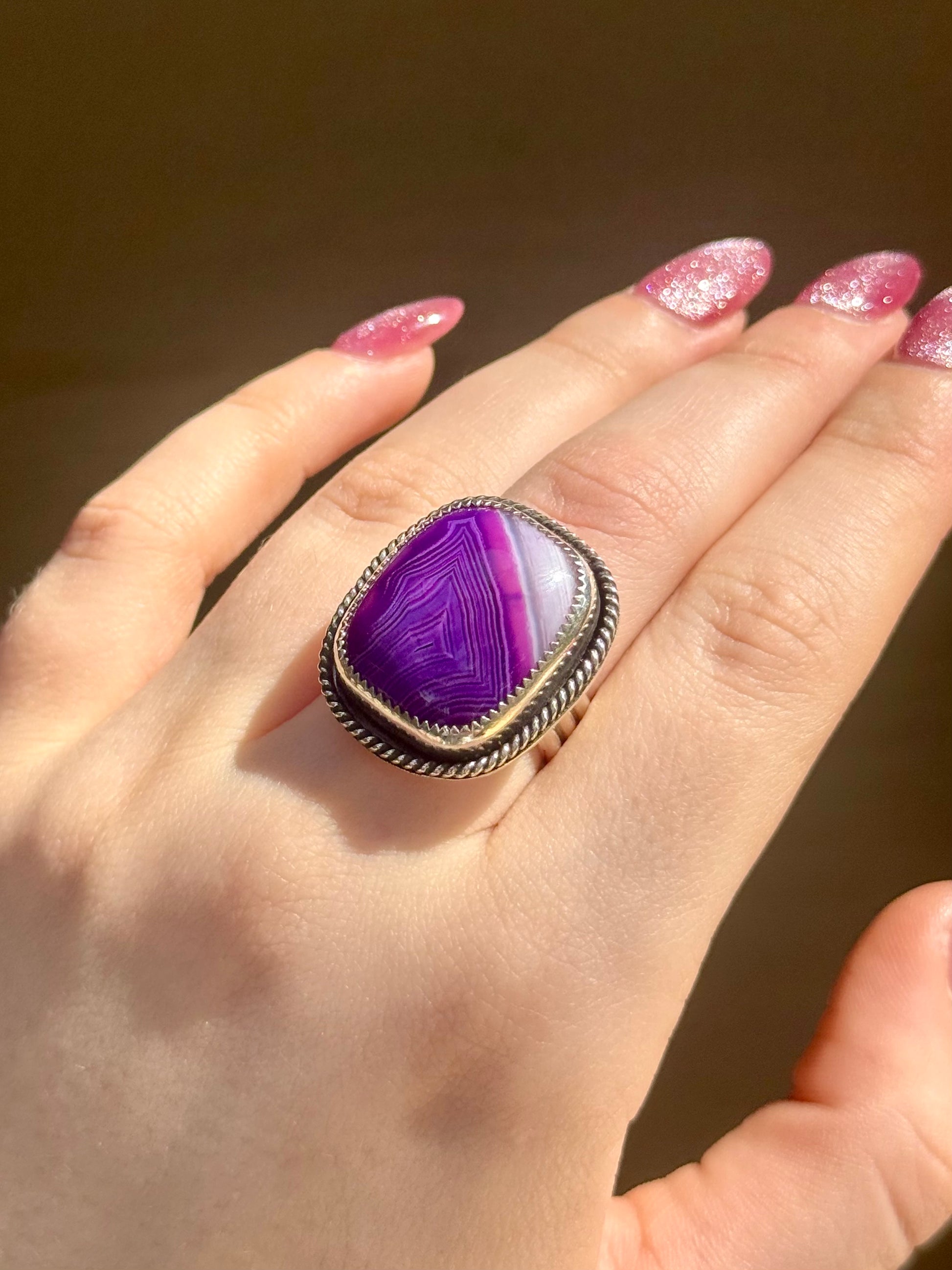 - A vivid purple banded agate is the star of this ring, set in an oxidized silver bezel with twisted rope detail.